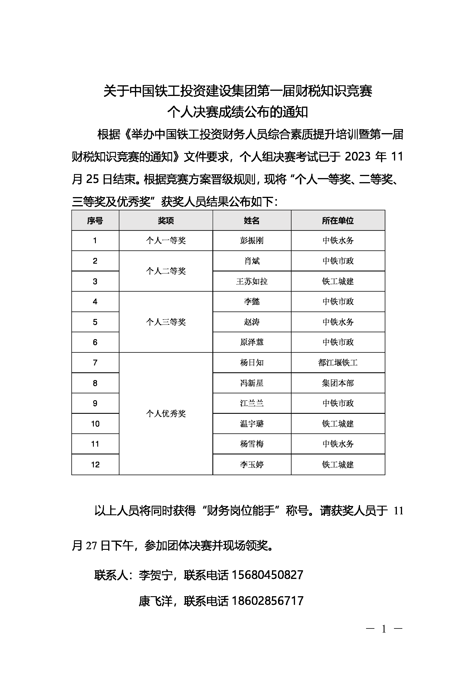 关于中国铁工投资建设集团第一届财税知识竞赛个人决赛成绩公布的通知