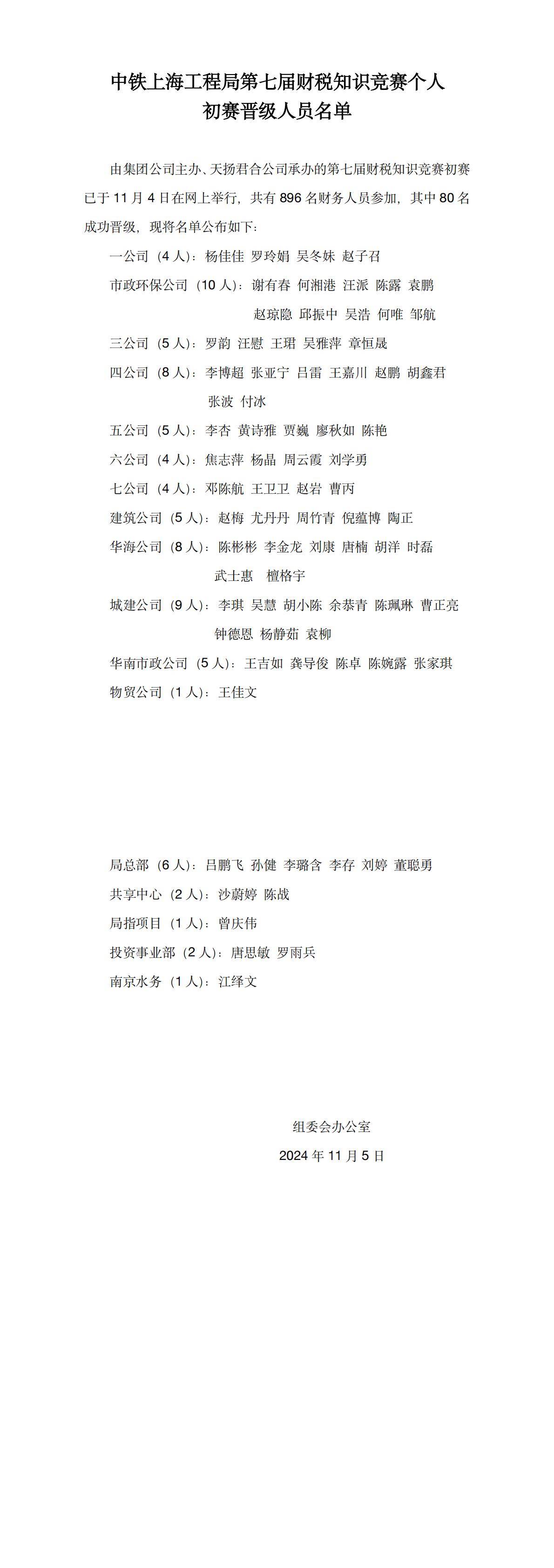 【晋级通知】中铁上海工程局第七届财税知识竞赛个人初赛晋级人员名单公布