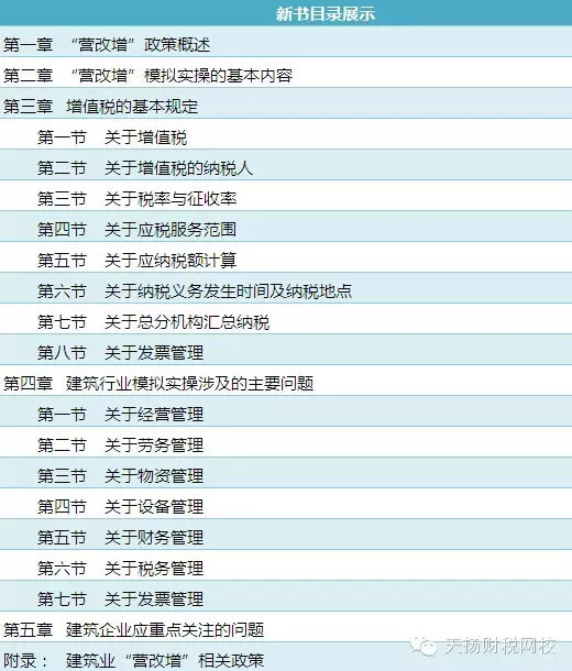 本书内容以实务为导向,将建筑业“营改增”实际操作中存在的涉税问题及经营管理等问题进行了深入研究与解答。全书采用一问一答方式,对行业内疑热点问题提出具体应对建议,是一本具有系统性、完整性和实务操作性的专业书籍。与内容相关小微视频课程已同步在天扬建筑业财税网校上线。与内容相关小微视频课程已同步在天扬建筑业财税网校上线。