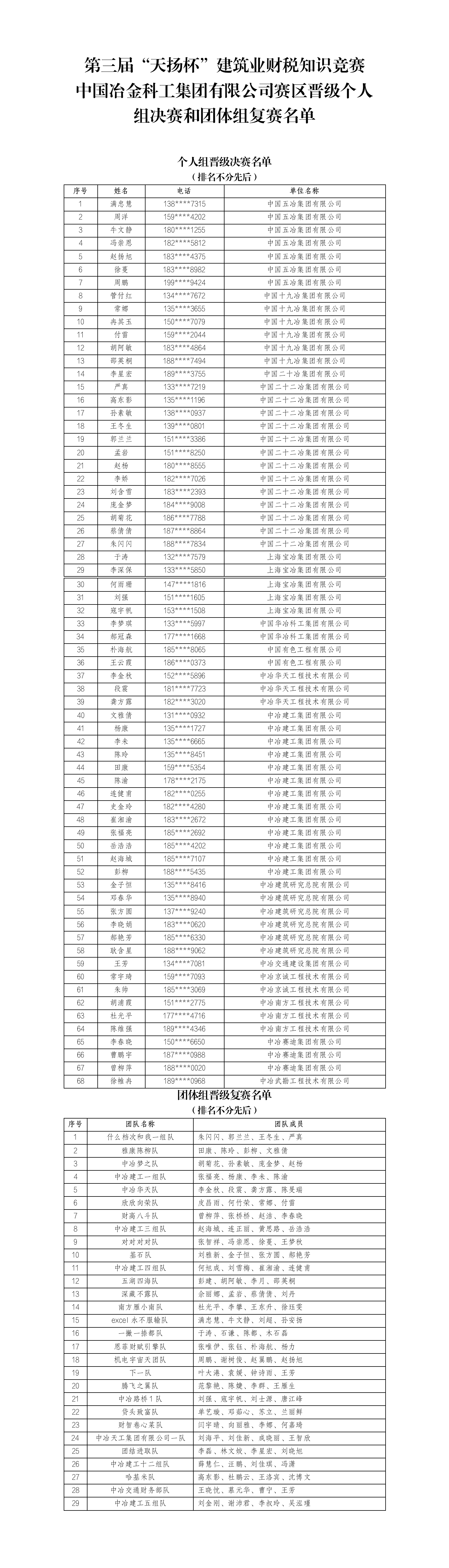 中国冶金科工集团有限公司赛区晋级个人组决赛和团体组复赛名单