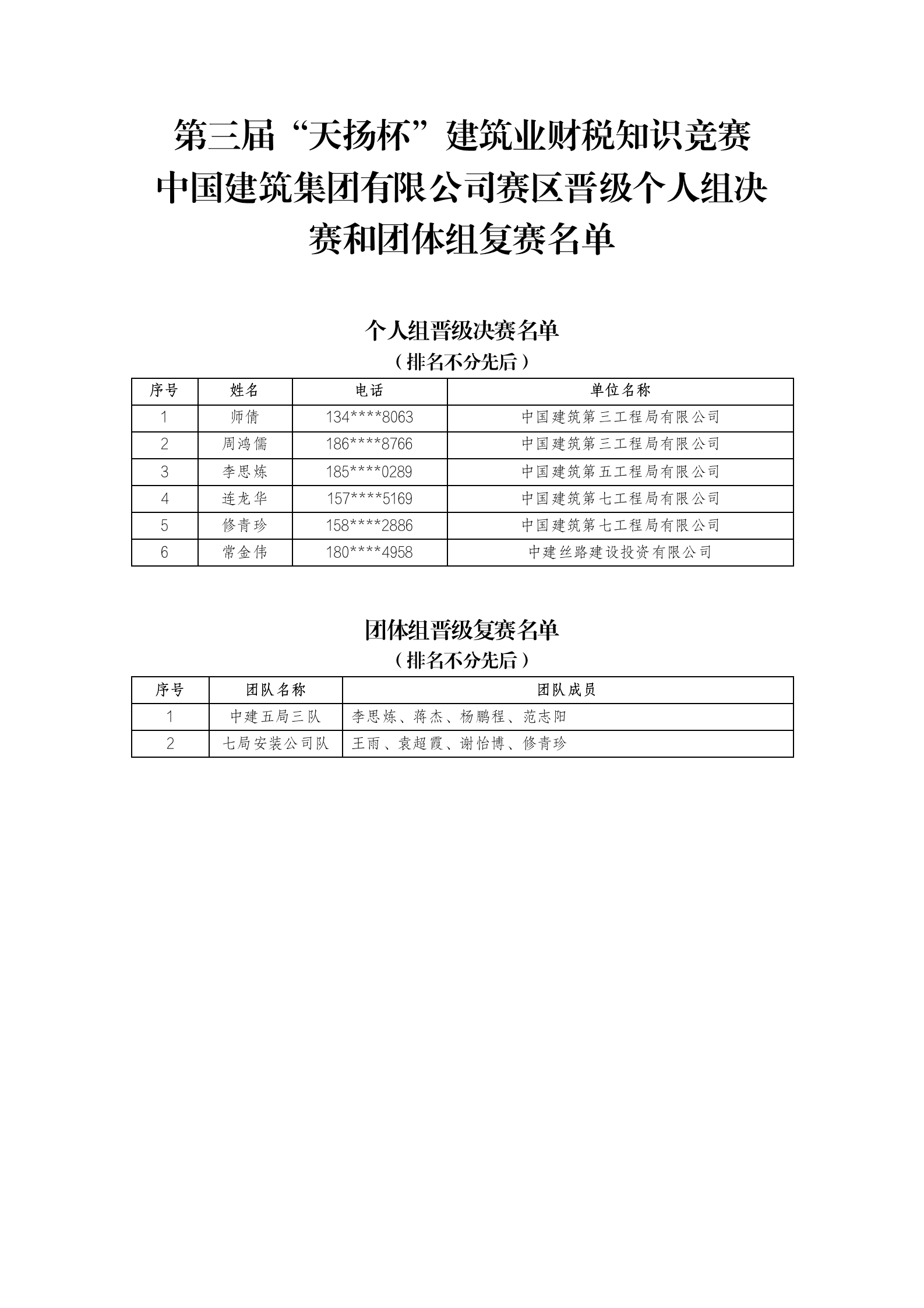 中国建筑集团有限公司赛区晋级个人组决赛和团体组复赛名单