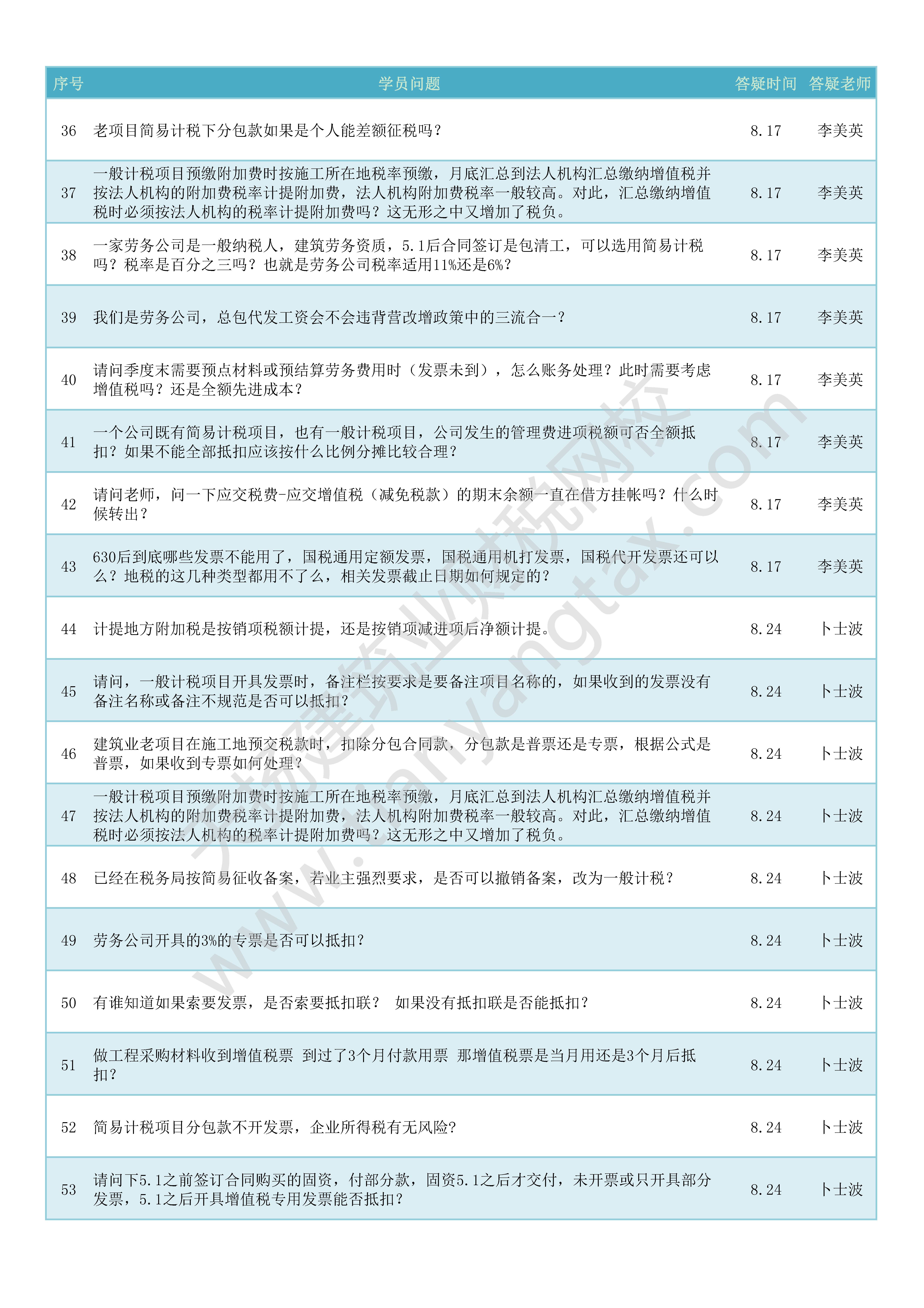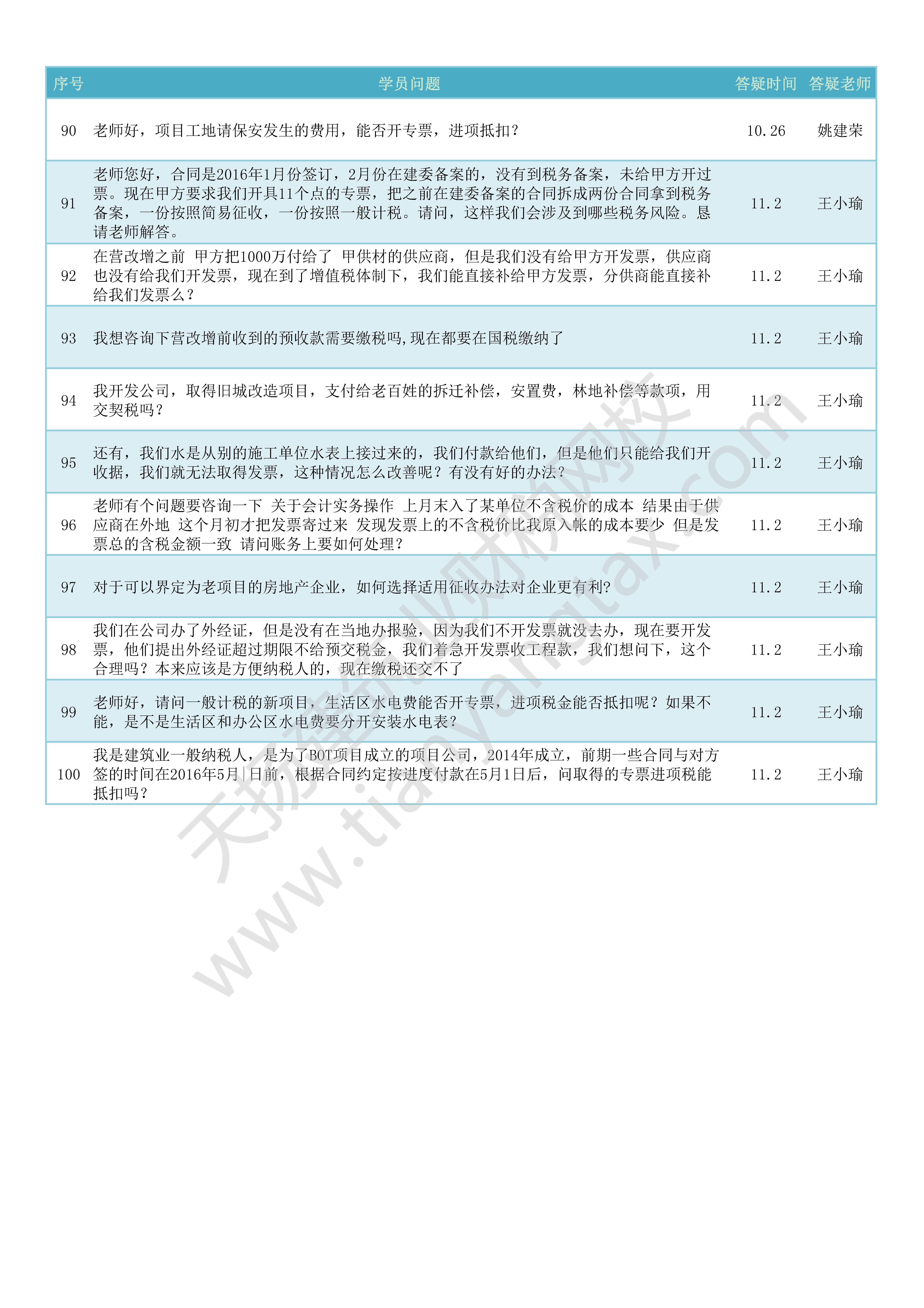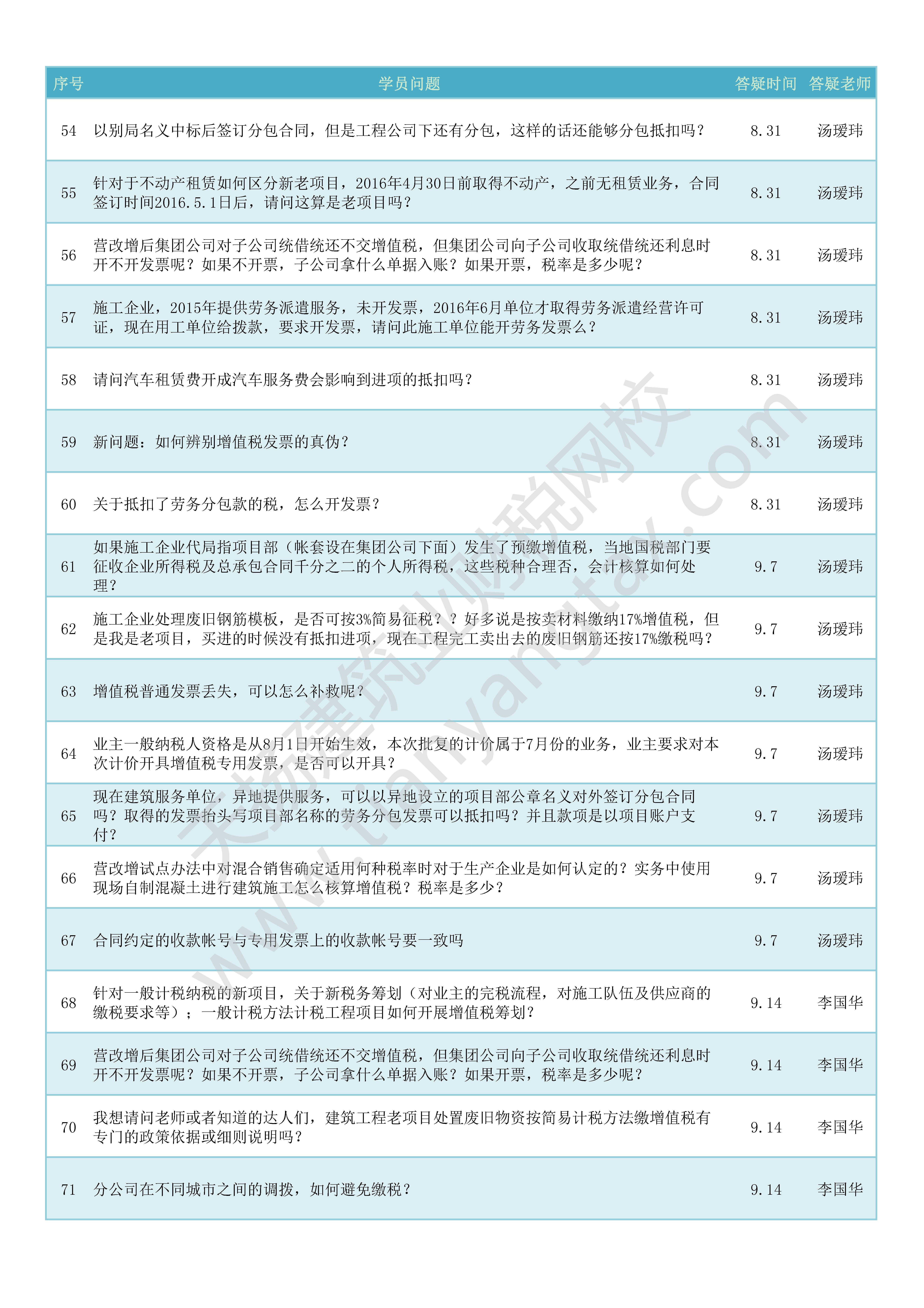 【5个月时间,17节微课,100个学员问题】 天扬想对您说: 简单的事情重复做,你就是专家。 重复的事情用心做,你就是赢家。 6月1日以来,天扬微课老师在答疑环节共回答了学员的100个问题啦! 今天将我们的共同杰作(问题库)回馈给大家,信任、陪伴、鼓励,天扬有您会更完美~ 天扬建筑业财税网校:一切为了学员!
