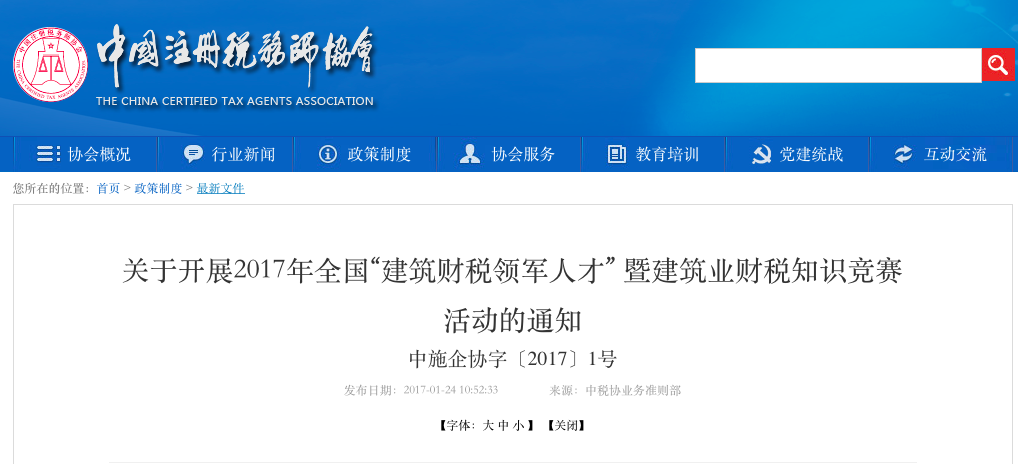 【中国注册税务师协会】关于开展2017年全国“建筑财税领军人才” 暨建筑业财税知识竞赛活动的通知