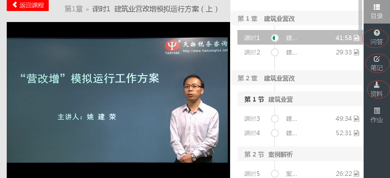 新的听课界面,增加了“问答”、“笔记”和“资料”等功能。你可以在“资料”处下载本节课程的讲义和其他资料,可以在“问答”处针对本节课程提问题,可以在“笔记”处记下你的学习体会。有了天扬建筑业财税网校,领导再也不用担心我的学习,哪里不懂点哪里,so easy!