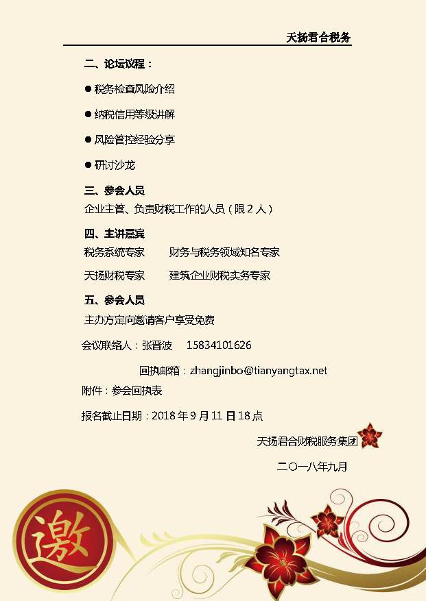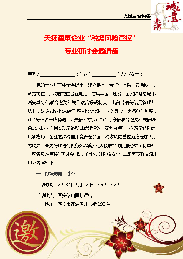 天扬建筑企业“税务风险管控” 专业研讨会邀请函(西安站)