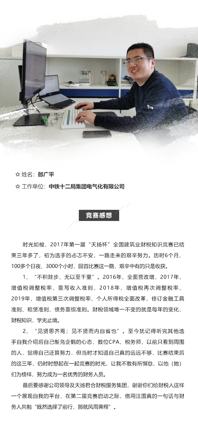 时光如梭,2017年第一届“天扬杯”全国建筑业财税知识竞赛已结束三年多了,初为选手的忐忑不安,一路走来的艰辛努力