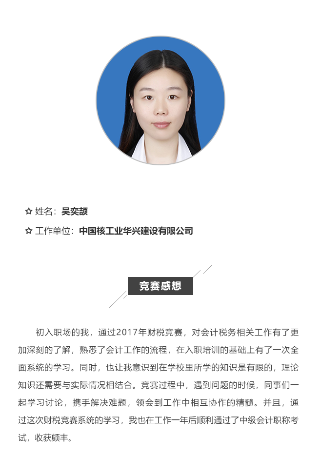 初入职场的我,通过2017年财税竞赛,对会计税务相关工作有了更加深刻的了解,熟悉了会计工作的流程,