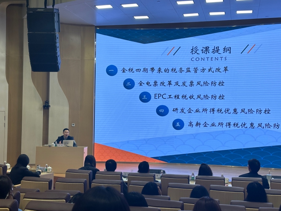 第一期培训邀请到了国家税务总局税务干部学院的石玮老师进行授课,授课内容包括金税四期带来的税务监管方式与变革、全电票改革及发票风险防控、EPC工程税收风险防控以及高新企业所得税优惠风险防控等几个方面。在培训结束后,老师针对学员在实际工作遇到的疑难点问题进行解答,从而进一步增强了培训效果,提高了学员的学习效率。