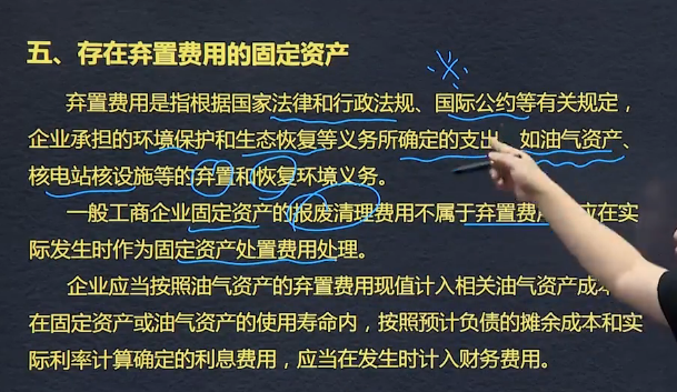 企业应当按照尤其资源的弃置费用限制计入相关油气资产成本;在固定资产或油气资源的使用寿命内,按照预计负债的摊余成本和实际利率计算所确定的利息费用,应当在发生时计入财务费用