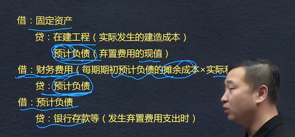 存在弃置费用的固定资产:弃置费用现值计入固定资产成本:借:固定资产,贷:在建工程,预计负债(弃置费用的现值)借:财务费用,贷:预计负债。