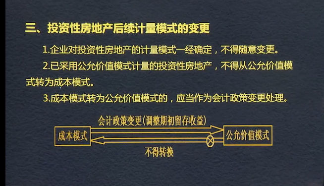 已采用公允价值模式计量的投资性房地产,不得从公允价值模式转为成本模式;成本模式转为公允价值模式的,应当作为会计政策变更。