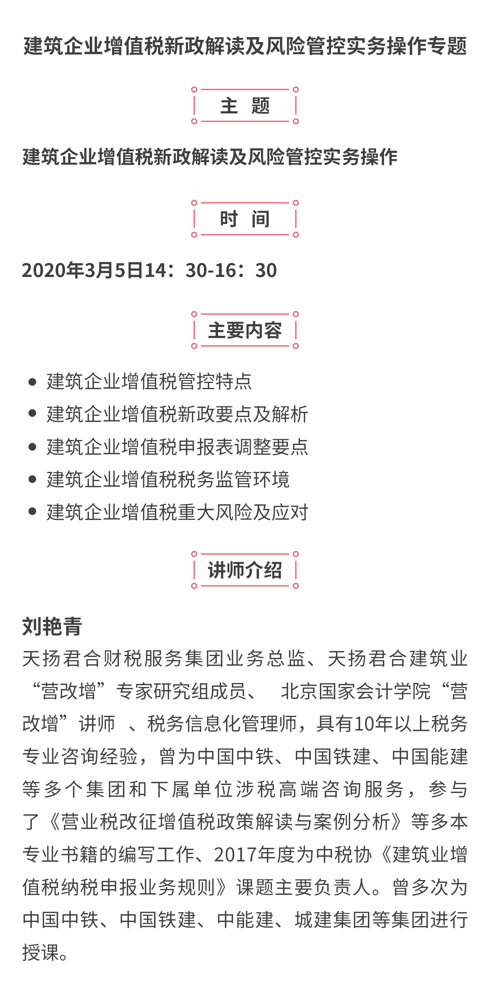 天扬君合财税咨询集团业务总监、天扬君合建筑业“营改增”专家研究组成员、 北京国家会计学院“营改增”讲师 、 主要负责中铁十二局集团有限公司及其下属子公司、中能建山西公司、中铁二十五局三公司等营改增咨询业务,参与了《营业税改征增值税政策解读与案例分析》等多本专业书籍的编写工作、2017年度为中税协《建筑业增值税纳税申报业务规则》课题主要负责人。曾多次为中国中铁、中国铁建、中能建、城建集团等集团进行营改增授课。